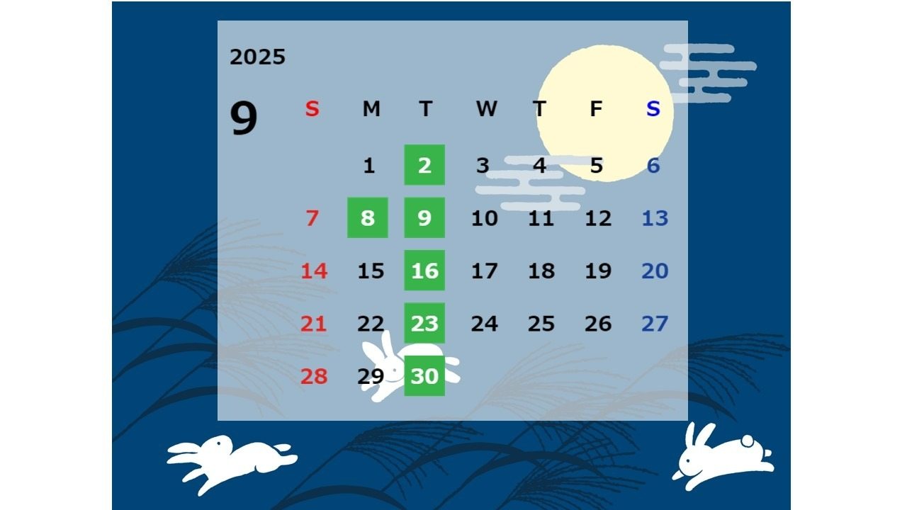 🎑9月の営業日のご案内 2025.08.27 カレンダー 大阪トヨタNorth163緑地北店 9月の営業日 こんにちは、 大阪トヨタNorth163緑地北店です。 ご覧いただき ありがとうございます_(._.)_ まだまだ暑い日が続きますが 間もなく🎑9月、 そろそろ秋の気配が 待ち遠しいですね! 今回は 9月の営業日のご案内を させていただきます。 ■定休日(店舗により定休日が異なります。 詳細は店舗ページの営業日カレンダーを ご確認ください。) 9月は第2月曜日の8日が 定休日になります。 何卒宜しくお願い致します。 前の記事へ 店舗ブログ一覧に戻る 次の記事へ