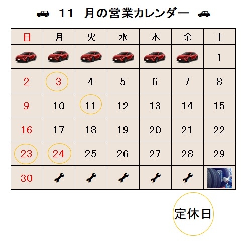 🚙 11月の営業日のご案内 🚙 2025.10.30 大阪トヨタNorth松屋町店 大阪トヨタNorth 松屋町店です 10月下旬になり 寒くなってきました🤧 冬用タイヤの交換が 必要なお客様は お早めに ご予約を お願いします 交換後の 夏用タイヤのお預かり (タイヤ預かりサービス) も承っております 詳しくは画像をクリック 👇 11月松屋町店の 営業日のご案内です 営業時間外に 事故や トラブルでの ご連絡は 24時間サポートダイヤル 0120-84-8600 までお願いします! お車ご購入 点検・修理の お問い合わせは 大阪トヨタNorth 松屋町店へ お気軽に ご連絡ください 大阪トヨタNorthの詳細は 画像をクリック 👇 前の記事へ 店舗ブログ一覧に戻る 次の記事へ
