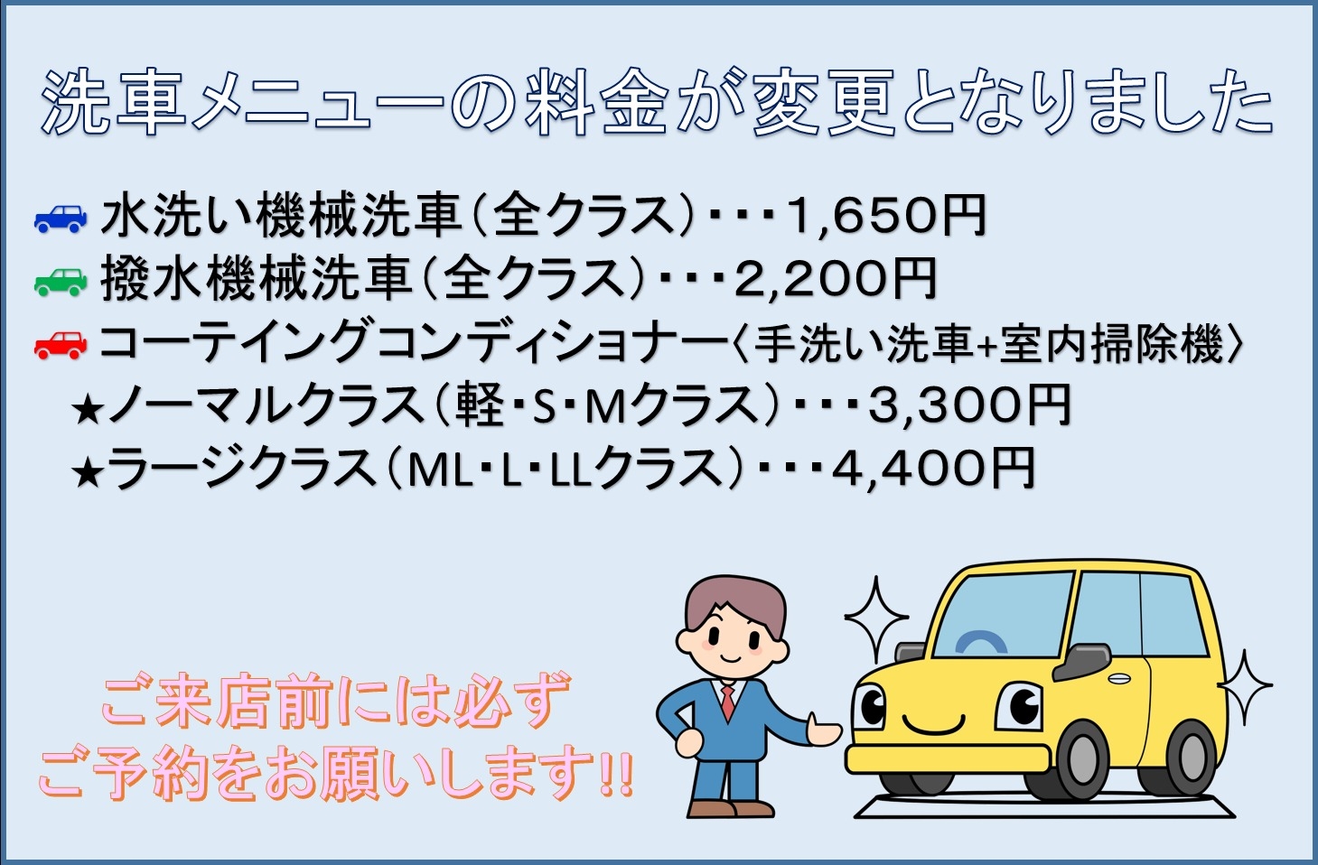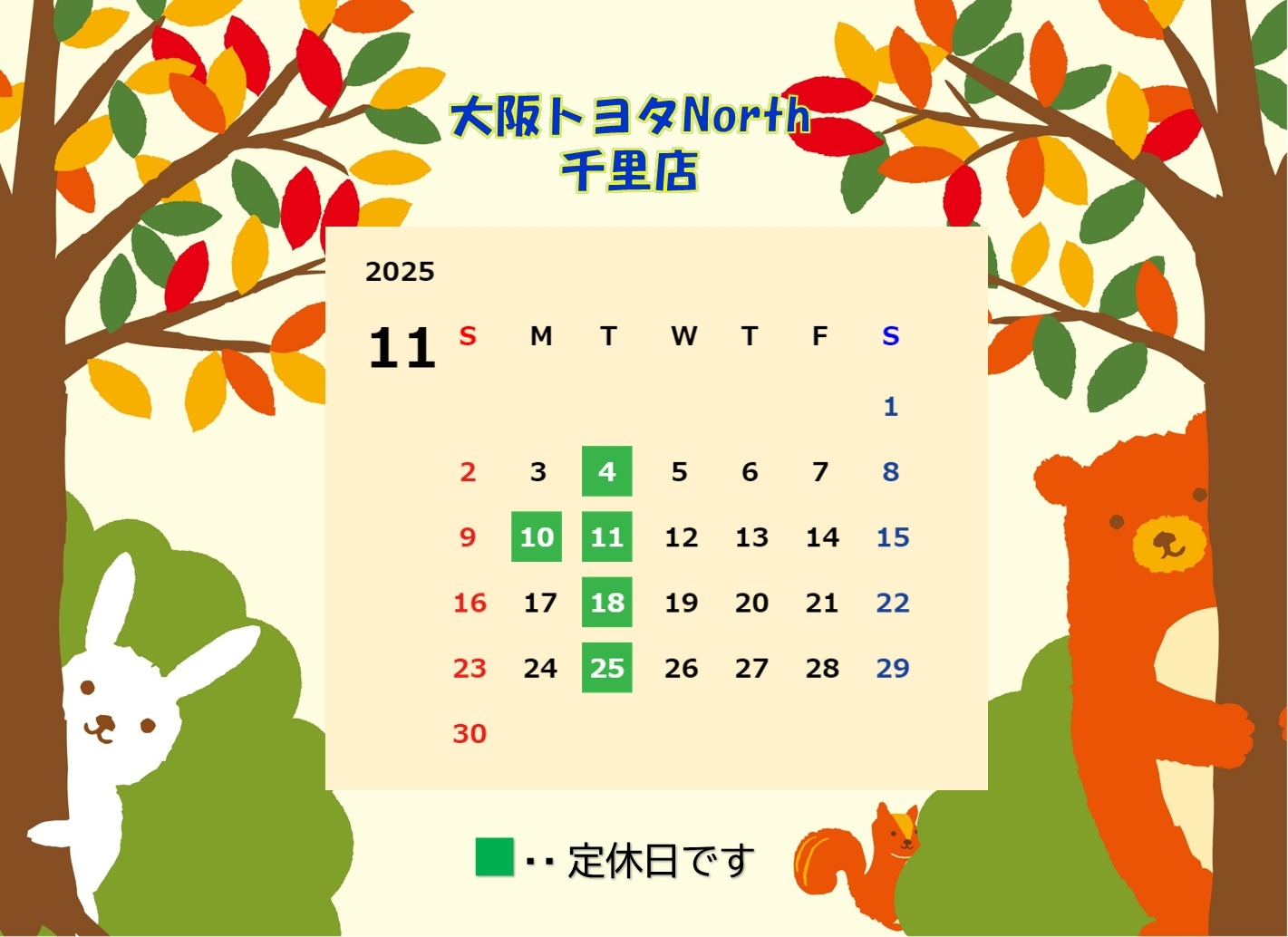 🍁11月営業日と洗車メニュー料金改定のご案内🍁 2025.11.01 洗車の料金改定ご案内 11月営業日のご案内 みなさま こんにちは😊 大阪トヨタNorth千里店です! 朝晩とっても寒くなってきましたね🧤 お身体ご自愛くださいませ!! 🍄🟫11月の営業日のご案内です🍄🟫 ※第二月曜日の10日は 定休日となります。 \\ お知らせ // 11月より洗車メニューの 料金が変更となりました🚙 ※料金はすべて税込み価格です。 スタッドレスタイヤの 履き替え時期です❄️ 混み合いますので 早めのご予約をお願い致します⛄ ☎06-6831-8600 前の記事へ 店舗ブログ一覧に戻る 次の記事へ