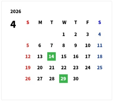 4月営業日のご案内 2026.03.31 4月営業日のお知らせ 大阪トヨタNorth 福島店 ⭐大阪トヨタNorth 福島店⭐ のブログをご覧いただき 誠にありがとうございます💖 本日は 🌸4月営業日🌸 のお知らせです! 緑色が 定休日です!! 皆様のご来店 お待ちしております😁 大阪トヨタNorth株式会社 福島店 福島区福島5-17-2 TEL 06-6455-8600 前の記事へ 店舗ブログ一覧に戻る 次の記事へ