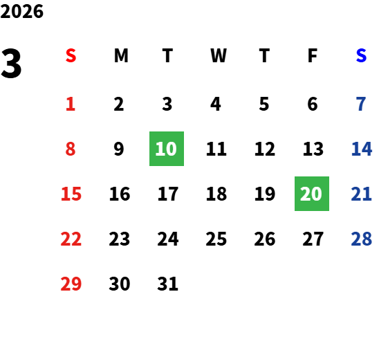 第2火曜日、祝日(但し、月によって変則的な場合がございます。詳しい定休日は営業日カレンダーをご確認ください。)
